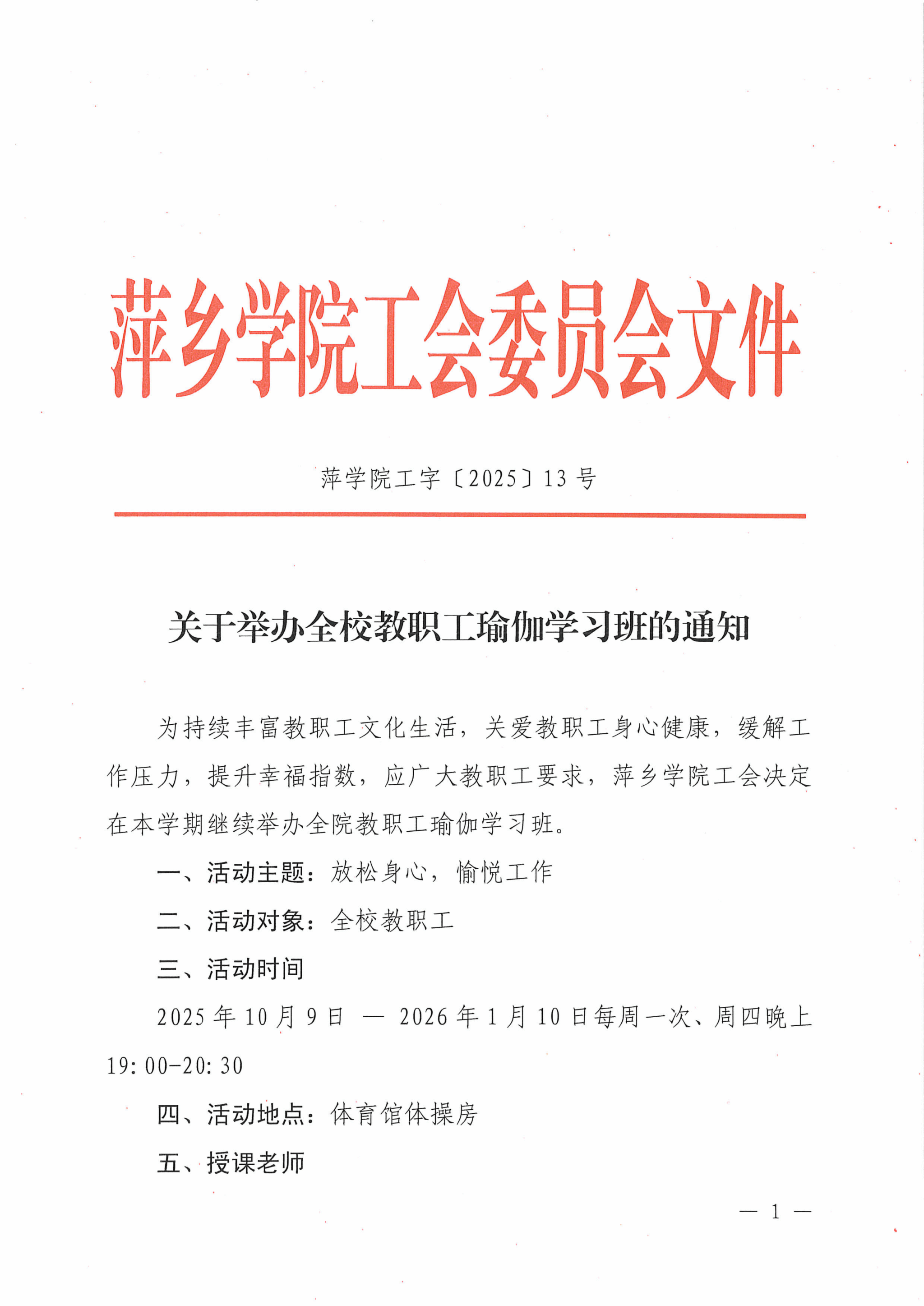 关于举办全校教职工瑜伽学习班的通知